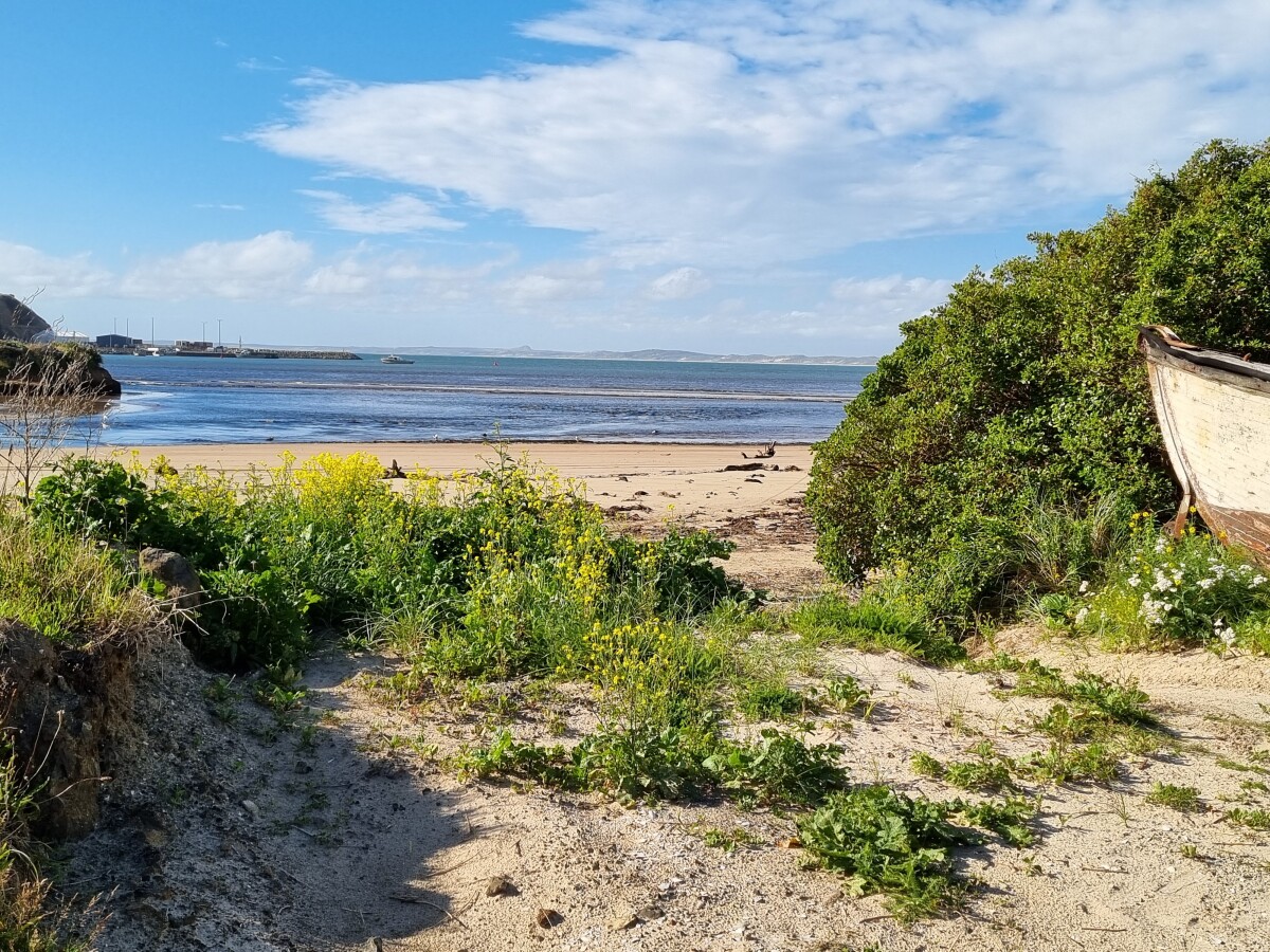 The sandy entrance to the beach at Waitangi. The prow of a white boat can be seen on the right. Petre Bay and Waitangi's wharf are in the background. Mangatukurewa Creek / Nairn River can be seen joining the bay on the left.