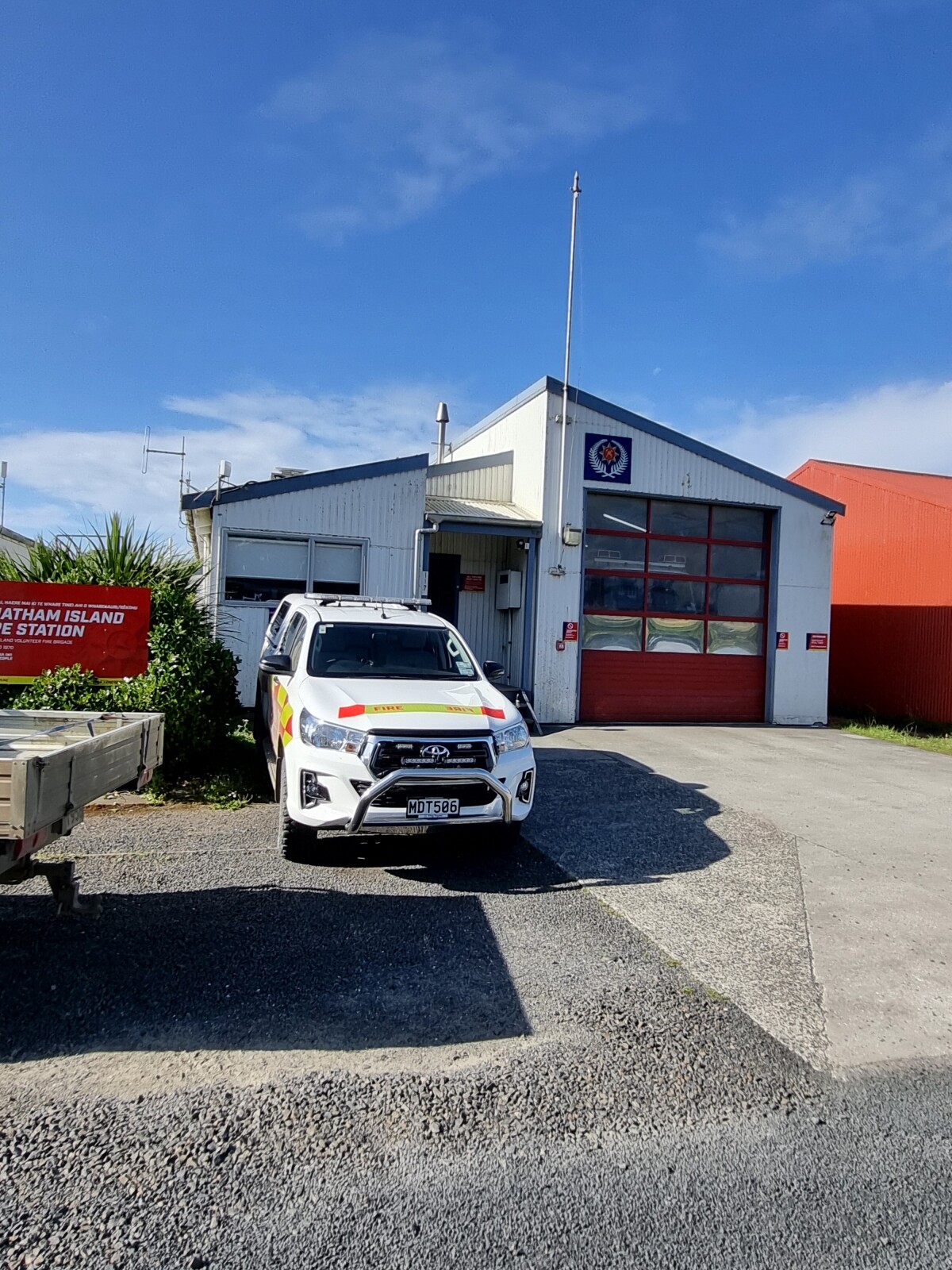 Chatham Islands fire station in Waitangi with a fire vehicle in the foreground.