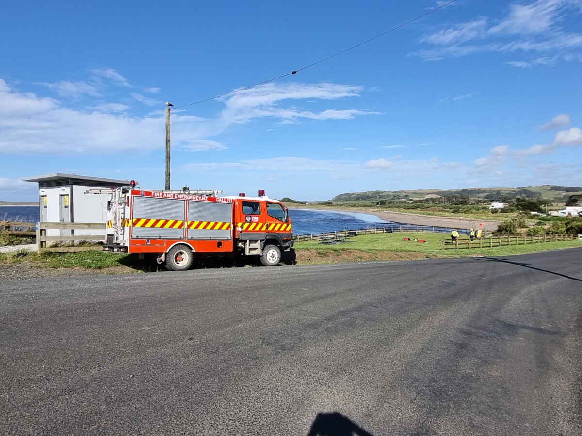 Volunteer fire fighters practicing in a grassy paddock in the evening. A fire engine is in the foreground. Petre Bay is in the background.