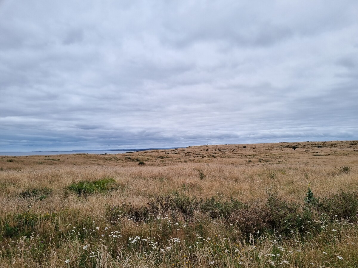 Field of yellow grass and shrubs, with the lagoon in the background.