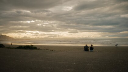 Sumner Beach at sunset, a couple are sitting on the beach. ...
