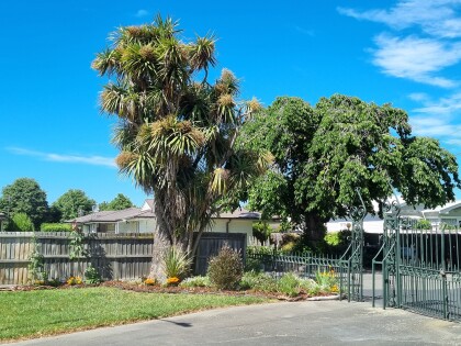 Some trees and a flowerbed at the Poulton Avenue entrance to ...
