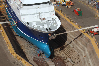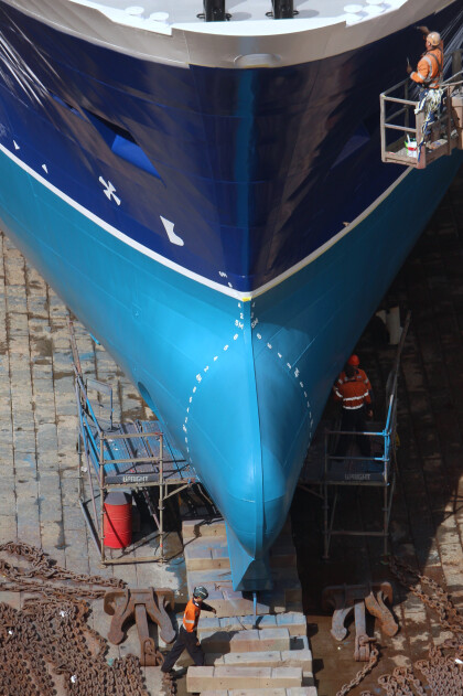 Workers painting the bow of the fishing trawler ‘Ocean Dawn’ ...