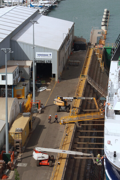 View along the Lyttelton Drydock as workers paint the hull of ...