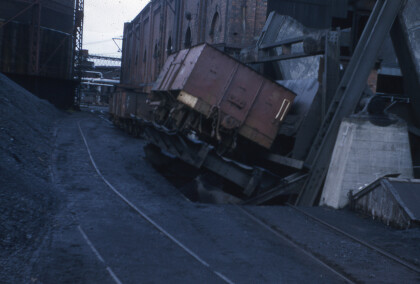 NZR coal wagon being emptied by tippler at Christchurch Gasworks
