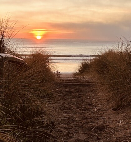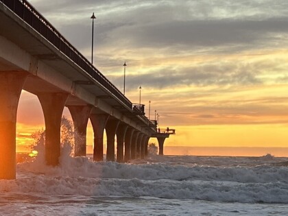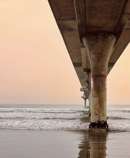 Dissected peach-hued sky seen from beneath New Brighton Pier as ...